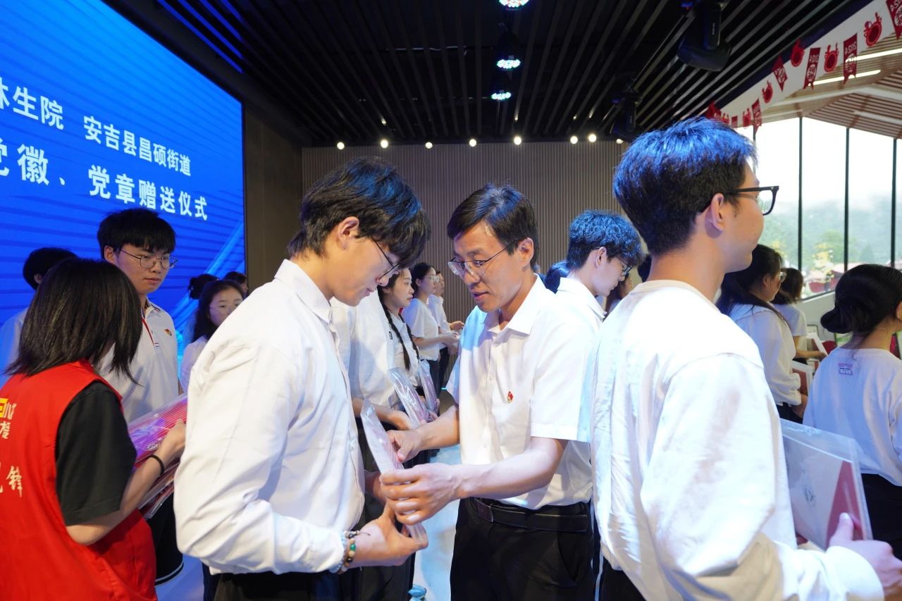 活动中,新发展党员面对鲜艳党旗,举起右手,进行庄严入党宣誓,郑炳松书记与安吉县委直属机关工委委员、组织科科长南璐向新党员赠送了党章、党徽、党费证、主题教育学习书籍、党员学习记录本“党员五宝”。