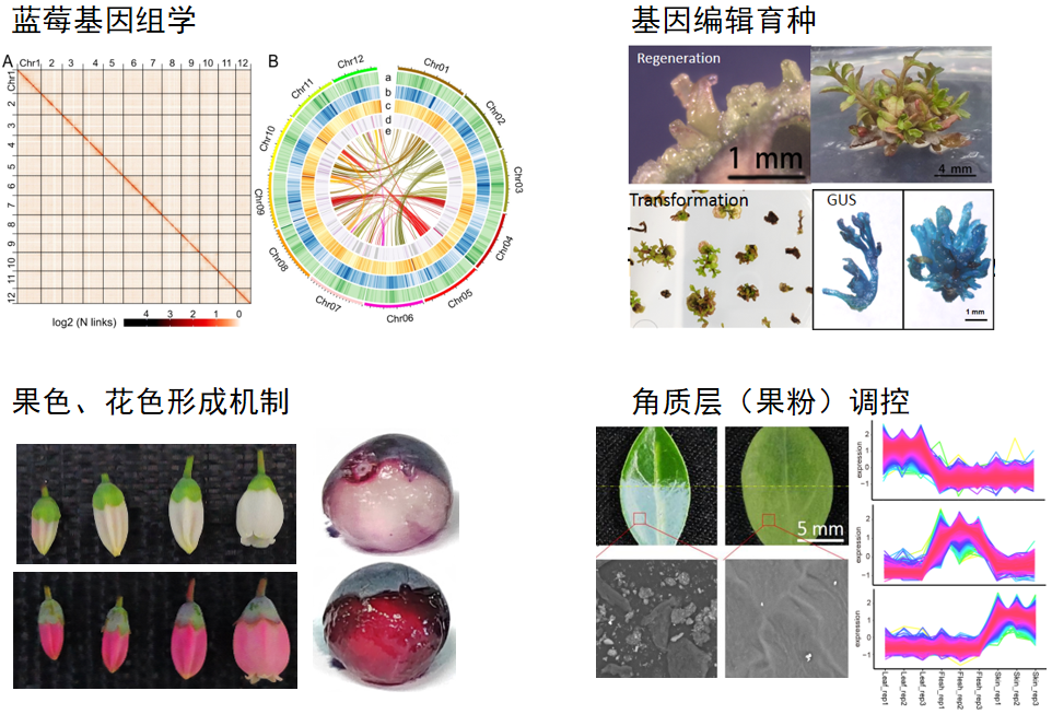 课题组研究方向:我们课题组开发了体型小、童期短的二倍体蓝莓作为模式林木,组装其精细基因组并构建了遗传转化体系。以模式蓝莓为研究材料,利用分子生物学、生物化学、生物信息学手段,挖掘蓝莓等特色植物逆境响应、花期、代谢合成相关基因,解析亚热带典型叶片结构与形成原理、角质层调节途径、林木花期控制、逆境信号途径等系列信号网络,为培育抗性好、品质高的林木种质提供候选基因和基础理论,并通过现代育种技术培育蓝莓新品种。现在已与新西兰、芬兰、意大利等国家建立蓝莓研究合作组,并同高新企业合作,开发蓝莓定向育种,提升蓝莓医疗保健价值。