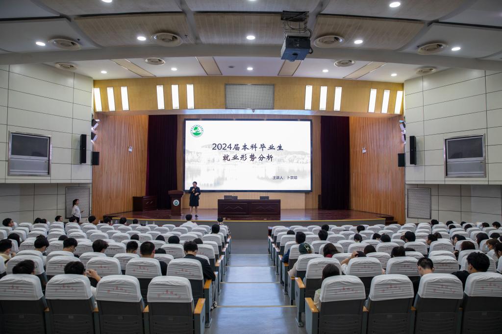 首先,卜京琼老师分析了2024届本科毕业生就业形势,她从考研、考公、出国深造、就业工作四个方面进行分析,结合近年来公司就业数据和学长学姐的案例,内容翔实地为同学们展示了毕业生未来发展道路的多样选择以及严峻形势。她鼓励同学们在吸取经验的基础上,结合自身志趣和未来规划,树立目标,找准方向,早做准备,付诸行动。