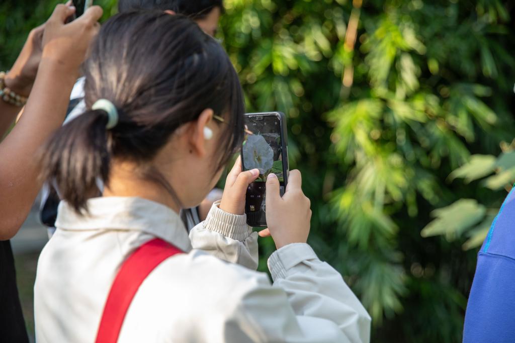 讲解员结合路过的植物介绍牌,一一讲解苏铁的生长习性与环境偏好、法国梧桐与双球悬铃木的不同等植物知识,参与的同学纷纷表示获益匪浅。生动的线下游园宣讲不仅使讲解员和志愿者加深对植物的了解,也让参与的员工近距离接触植物,让书本上的知识有了更清晰的轮廓。