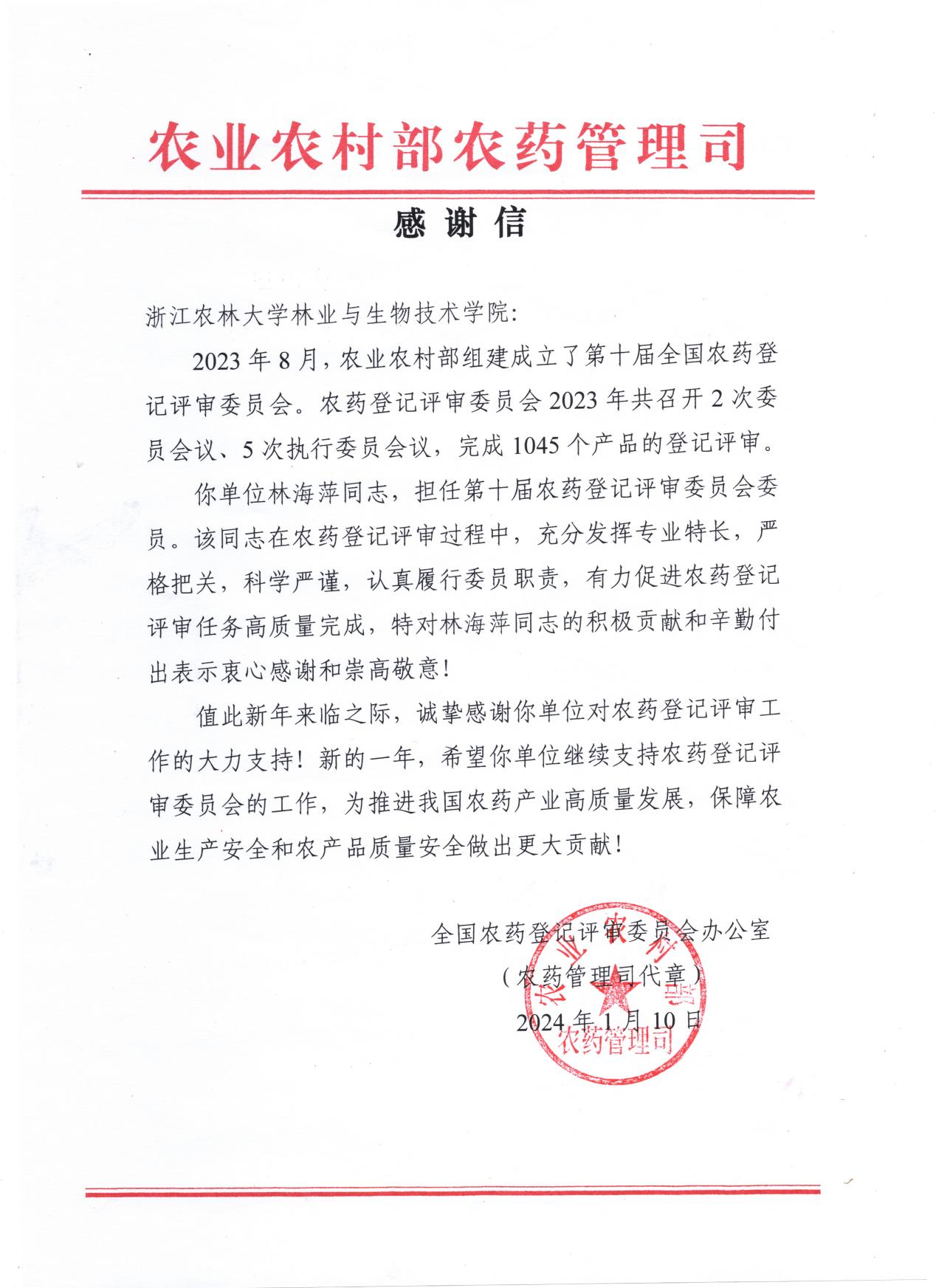 近日,公司收到农业农村部农药管理司发来的感谢信,对于公司林海萍教授在担任第十届农药登记评审委员会委员期间,对国家农药登记评审工作的大力支持表示诚挚的感谢。