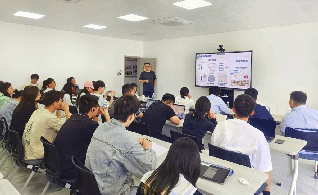 朱岩研究员围绕“系统药理学与系统生物技术”展开报告,向师生们讲述了如何利用多组学分析手段解析菌株工业生产和胁迫耐受的分子机制以及如何通过组学数据构建全细胞模型、开发仿真模拟算法,实现虚拟细胞工厂的优化设计。