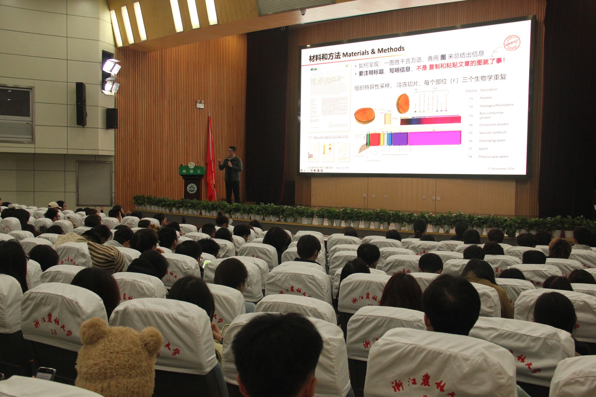 在本次讲座中,林楗仁教授用幽默的演讲风格,配合精彩的幻灯片展示,为同学们带来了一场生动而丰富的学术体验。讲座伊始,林楗仁教授详细讲解了科研学术报告的结构类型。紧接着,针对不同类型的文章,林教授细致地演示了汇报的技巧,并告诉大家如何规避汇报中易犯的错误。林教授强调,汇报内容需要有逻辑性和连贯性,并且鼓励同学们使用图、表、标题注明重要信息。最后,林教授精心准备了小彩蛋,将学术海报的构成和制作技巧与大家进行了分享,为同学们提供了实用的学术工具。讲座还设置了交流环节,方便林教授为同学们答疑解惑。本次讲座深入浅出,内容丰富,有较强的针对性和启发性。通过这次讲座,同学们对如何有效开展科研工作有了较为清晰的认识和思路。