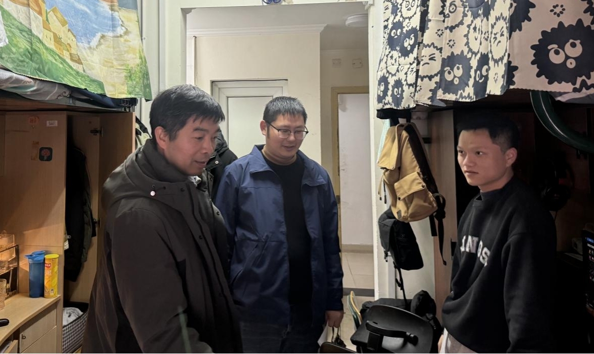 在宿舍内,陈健与同学们亲切交谈,关心他们的科研进展、生活状态及留校期间的计划,并了解他们在目前学习、生活中可能遇到的困难。并鼓励同学们要珍惜这个安静的假期时光,积极投入到科研和个人发展中,同时也要注意休息,保持良好的身心状态。