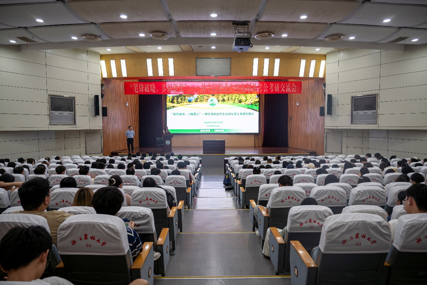 为帮助学子明晰考研考公发展路径,科学规划未来方向,点燃学习热情,助力公司优良学风建设,5月15日晚,公司于图书馆第一报告厅成功举办“笔锋破晓,步履逐光”考研考公交流会。活动特邀国家级人才、VSport体育教授、博士生导师章成君做交流分享,并邀请了7位2025届优秀员工代表展开主题分享,22级辅导员黄溪鸿出席本次活动,全体22级同学及部分23、24级同学参与活动。